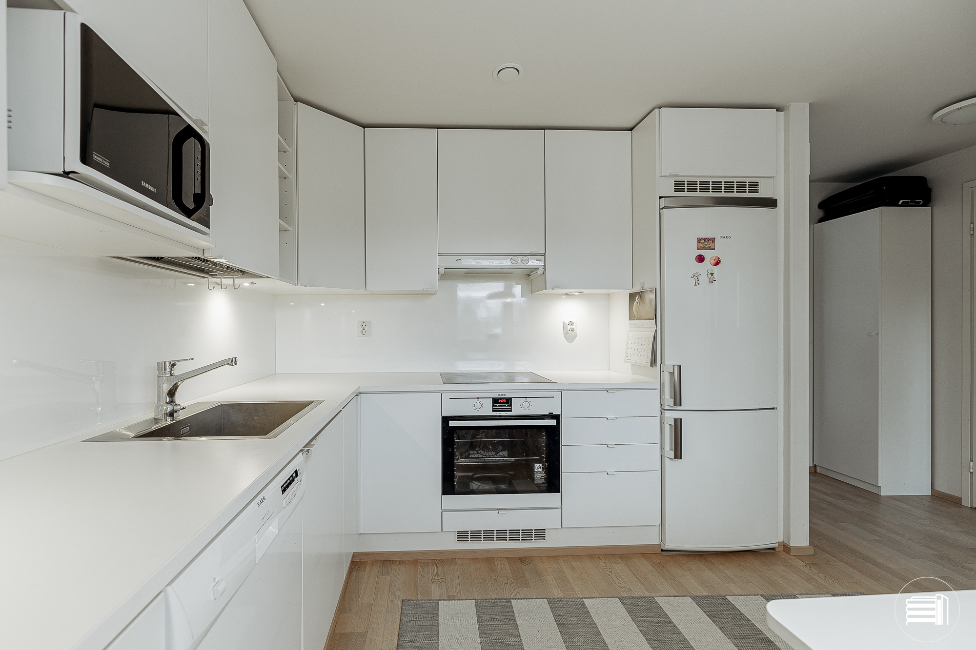 • keittiön kaapistot sileä, valkoinen kalusteovi, keraaminen tasoliesi erillisuunilla, liesituuletin, astianpesukone, jääkaappi/pakastin