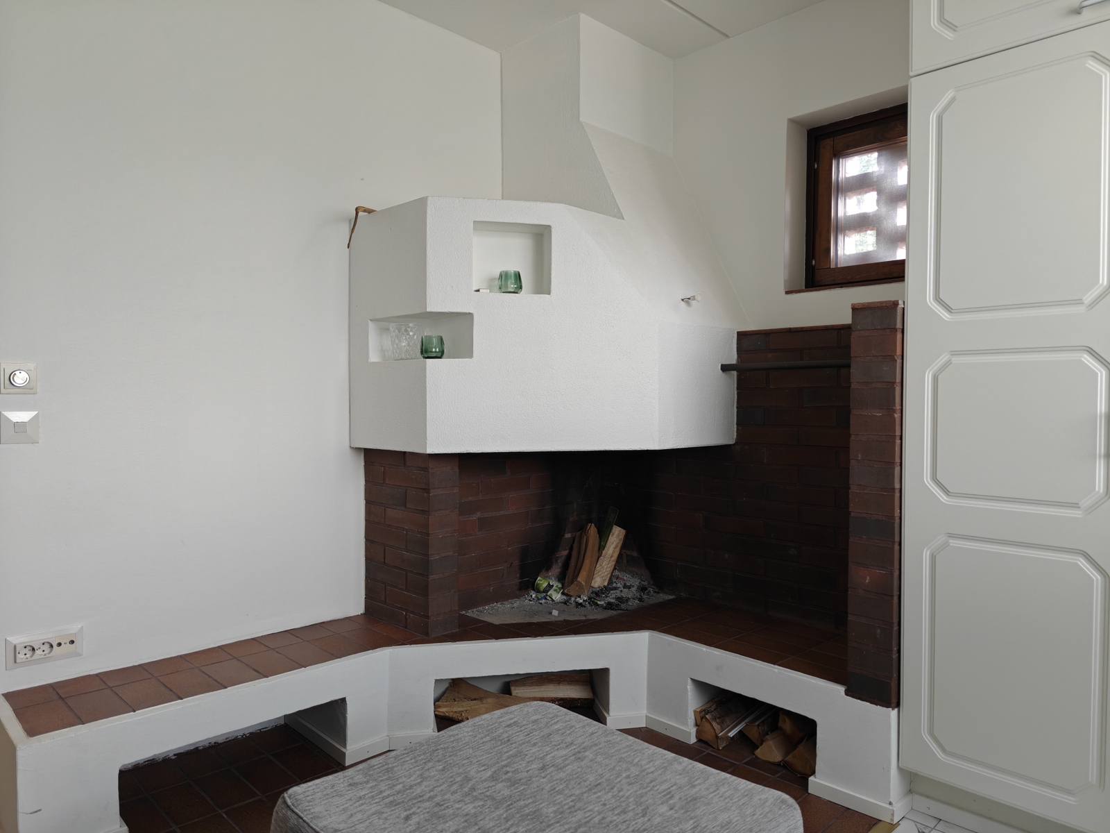 Tilojen kuvaus | Takkahuone, jossa toimiva takka. Eteisessä kaapistot. |