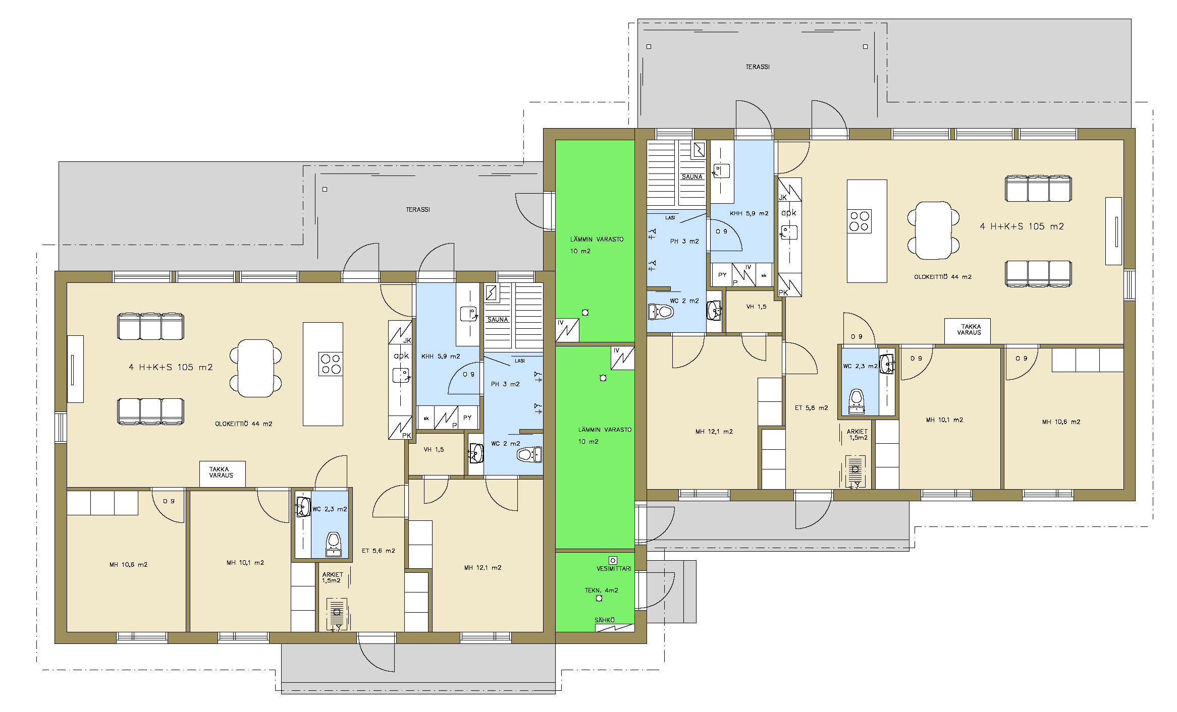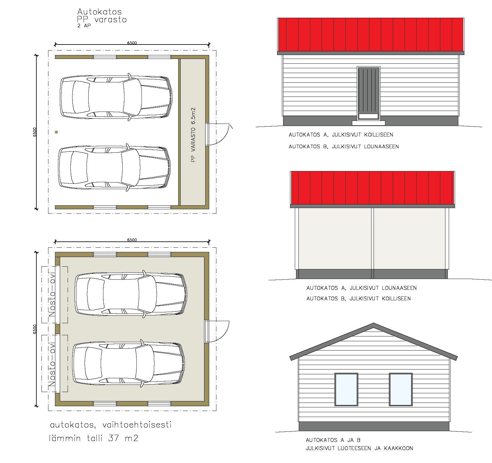 Asuntojen väliin rakennettavat lämpimät varastot tuovat yksityisyyttä ja rauhaa. Molemmilla huoneistoilla on oma 10 m² lämmin varasto. Lisäksi molempien autokatoksien yhteyteen rakennetaan 6,5 m² kokoinen ulkoiluvälinevarasto, joka tarjoaa reilusti lisätilaa harrastusvälineille. Omaan autokatokseen kuuluu kahden auton katos, joka on suunniteltu mahdollista muutosta varten – rakennusoikeus sallii katoksen muuttamisen 37 m² kokoiseksi lämpimäksi autotalliksi ja vesi- ja viemärivaraukset tehdään valmiiksi rakennusvaiheessa.