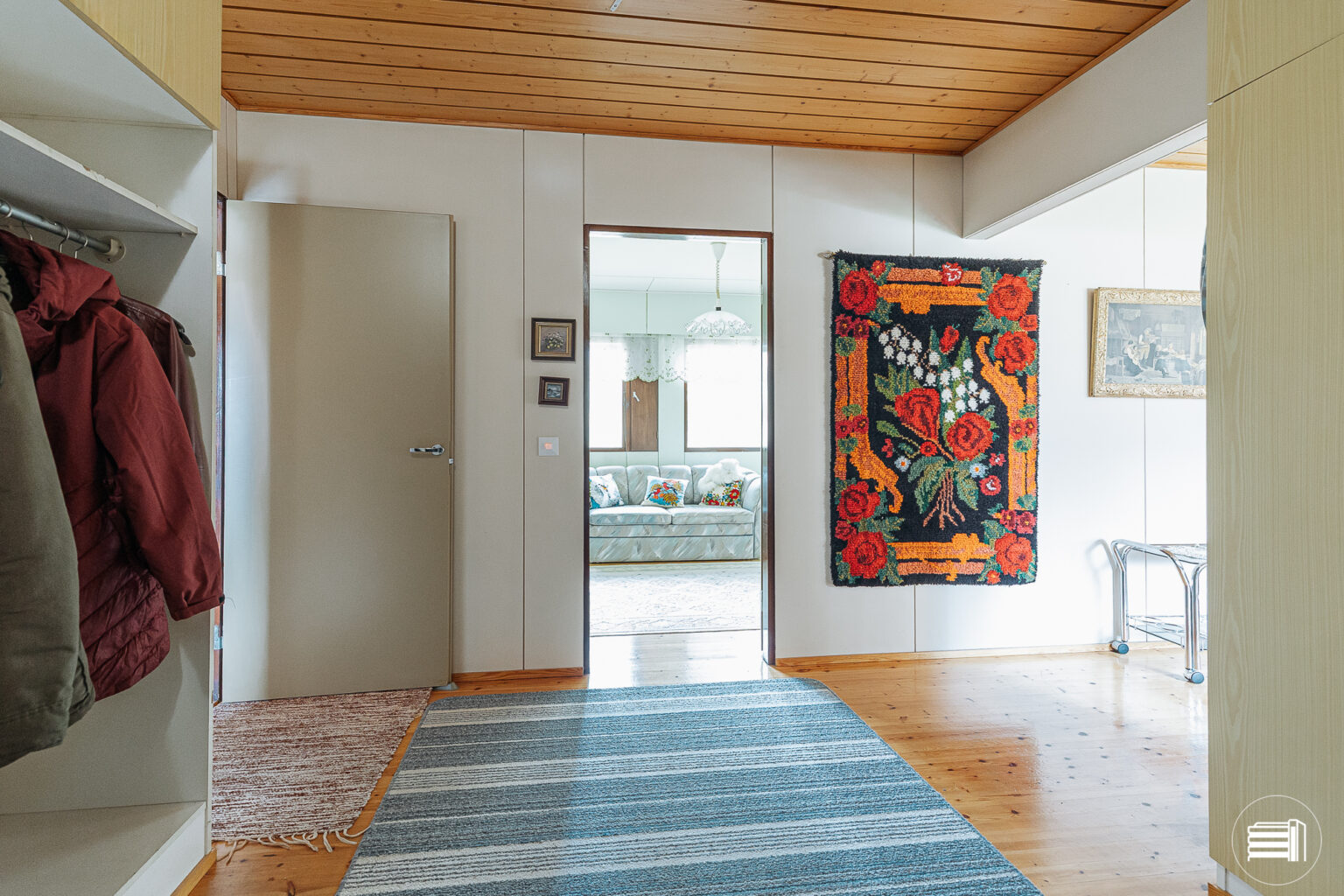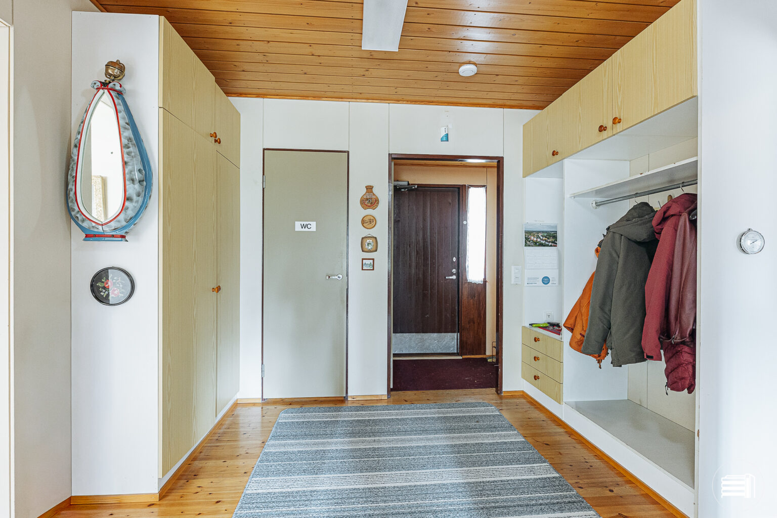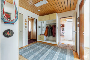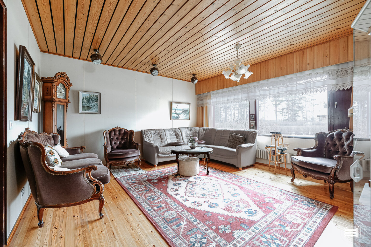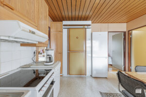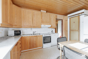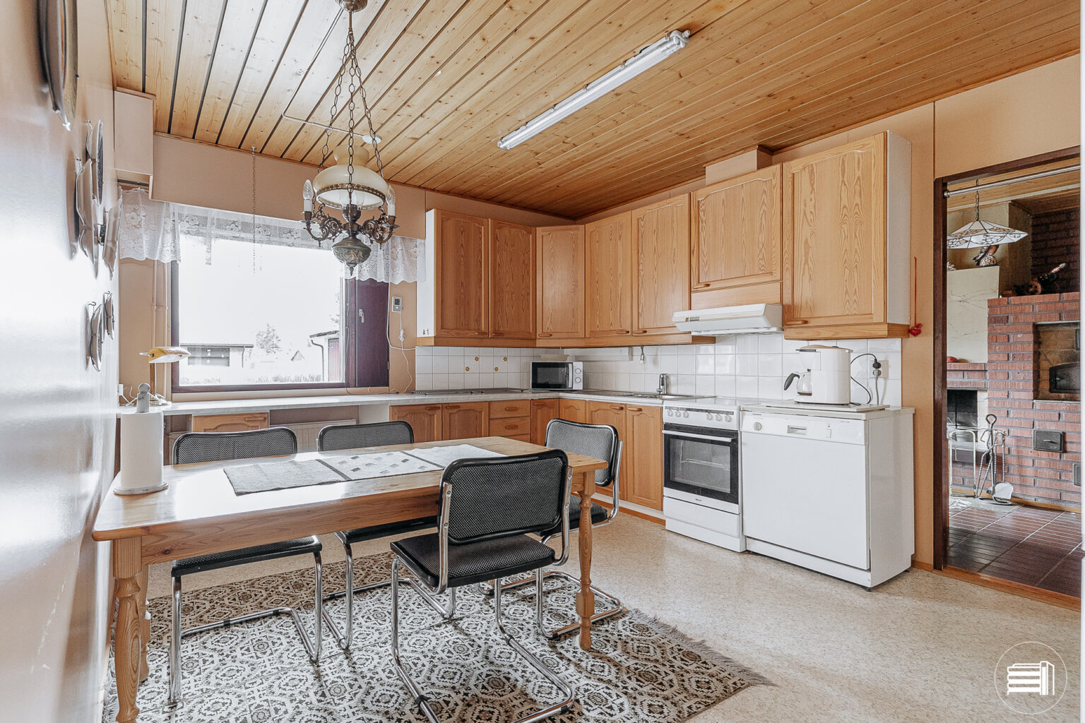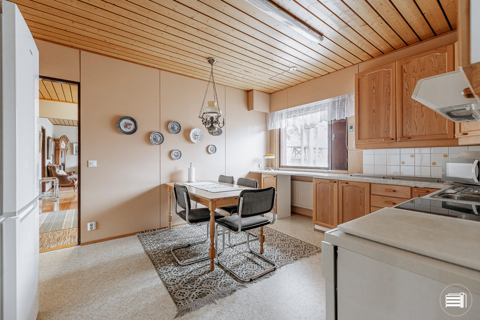 Rakennusajan henki näkyy sisustuksessa, jossa puumateriaalit tuovat kotiin lämpöä ja kodikkuutta.