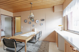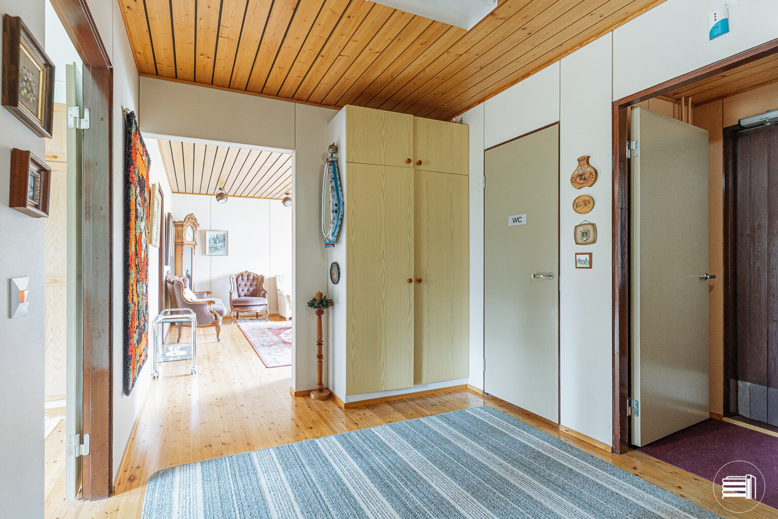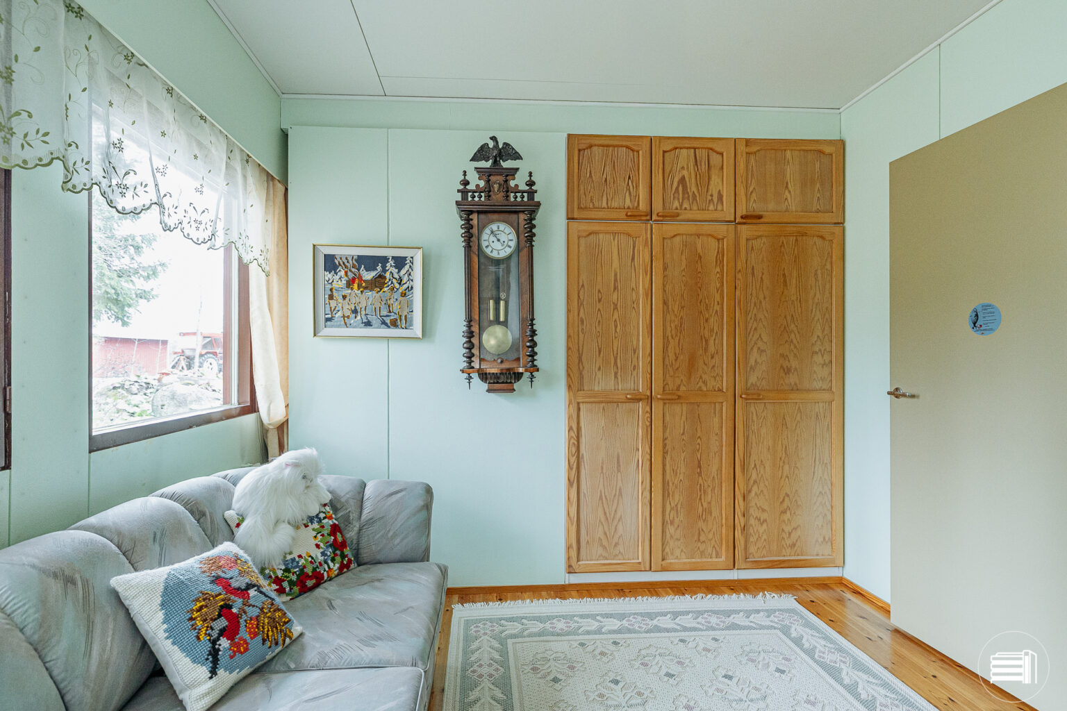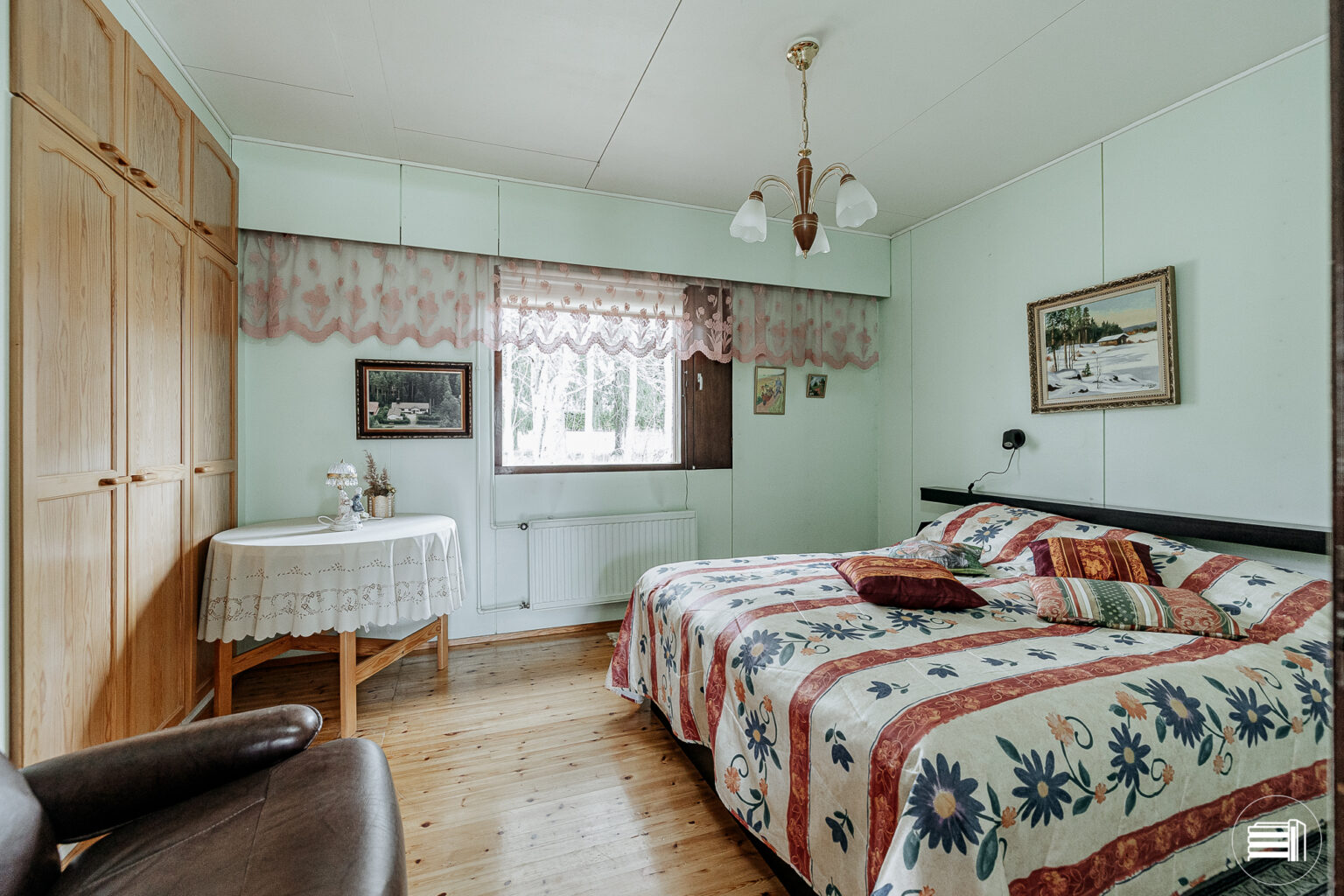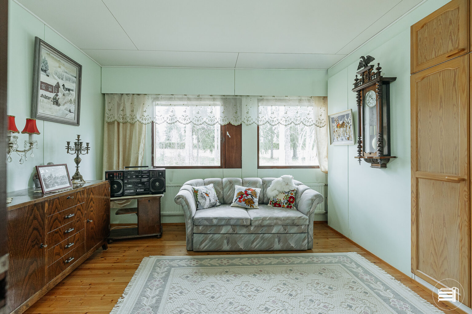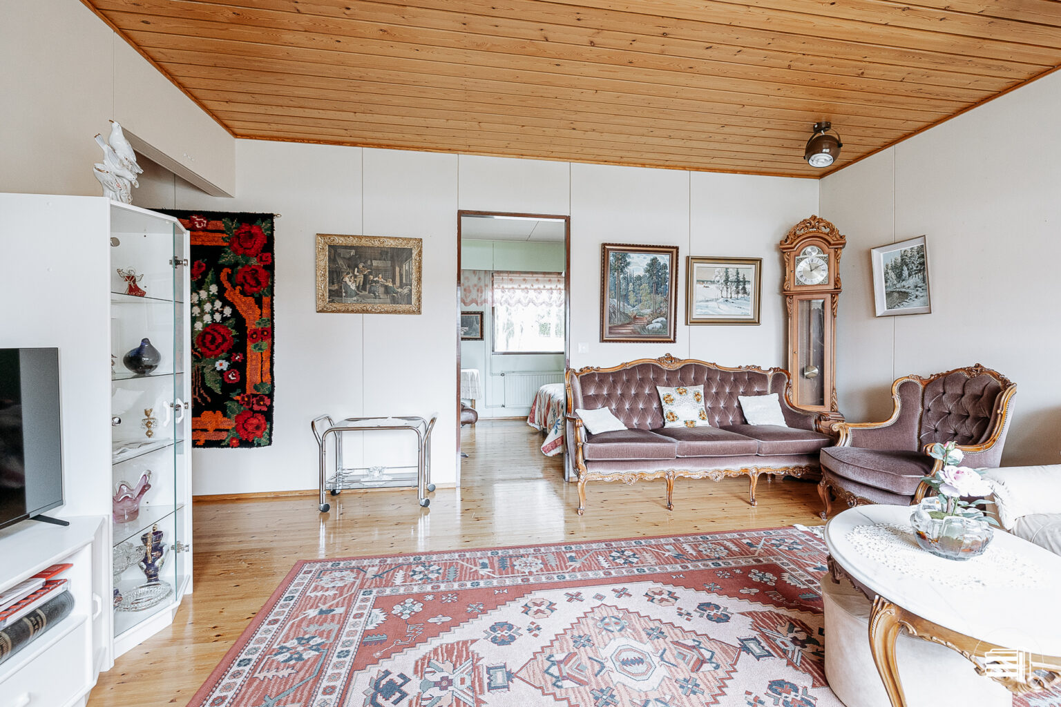 Rakennusajan henki näkyy sisustuksessa, jossa puumateriaalit tuovat kotiin lämpöä ja kodikkuutta.