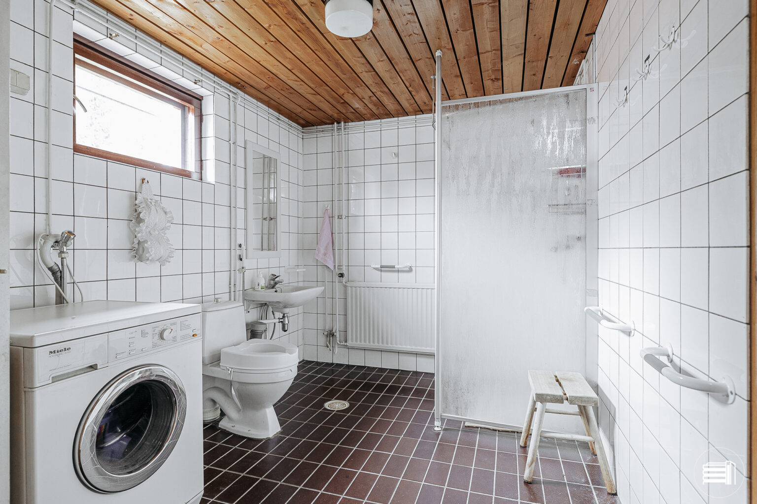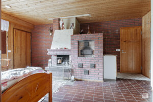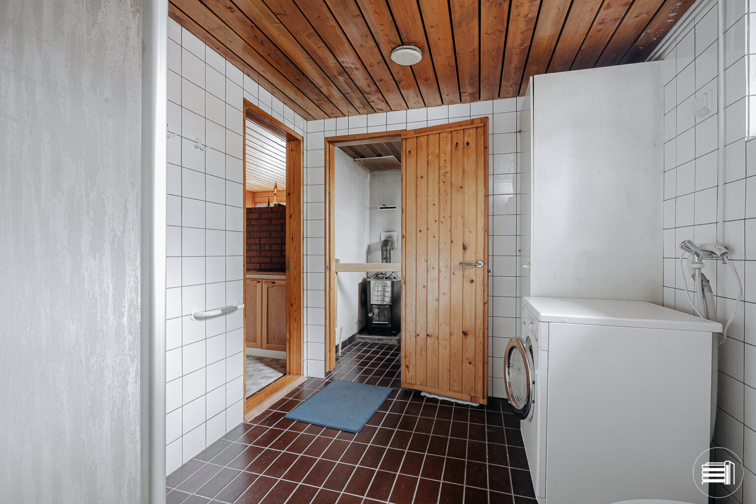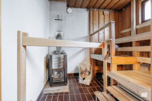 Pesuhuone on hyvänkokoinen ja siellä on talon toinen wc. Saunan puulämmitteinen kiuas on monen mieleen.