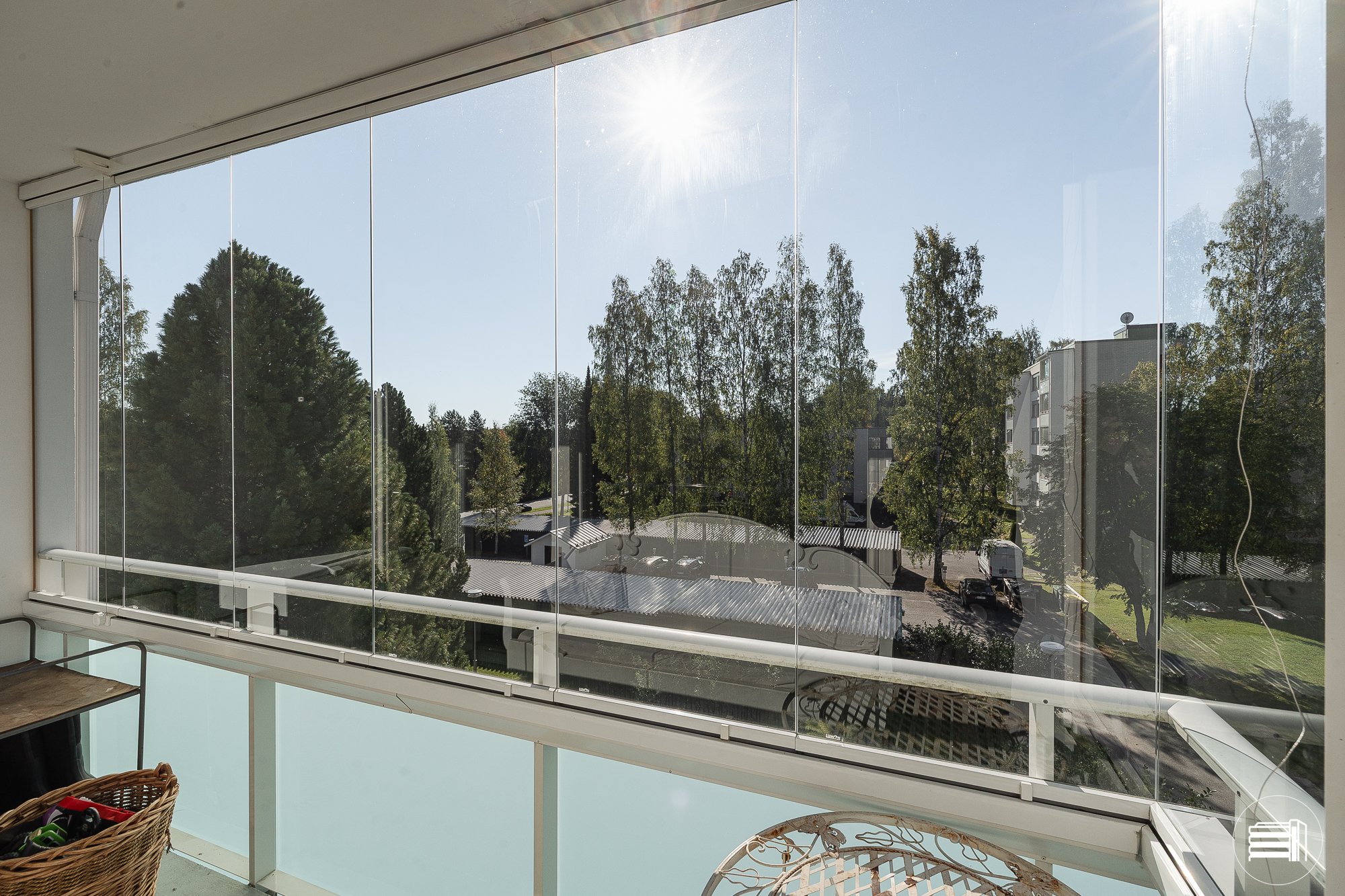 Lasitetulta parvekkeelta avautuu rauhalliset ja vehreät näkymät.