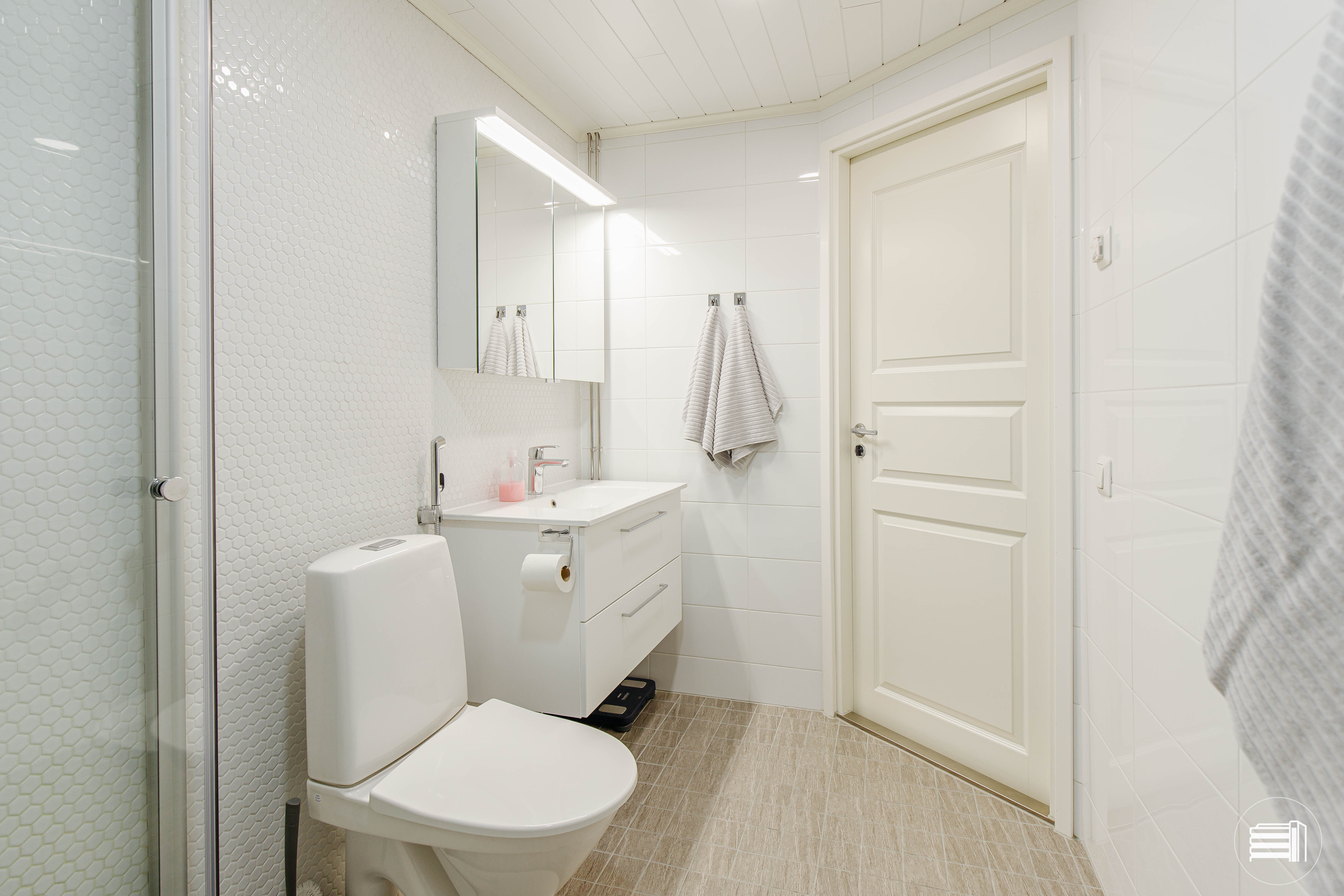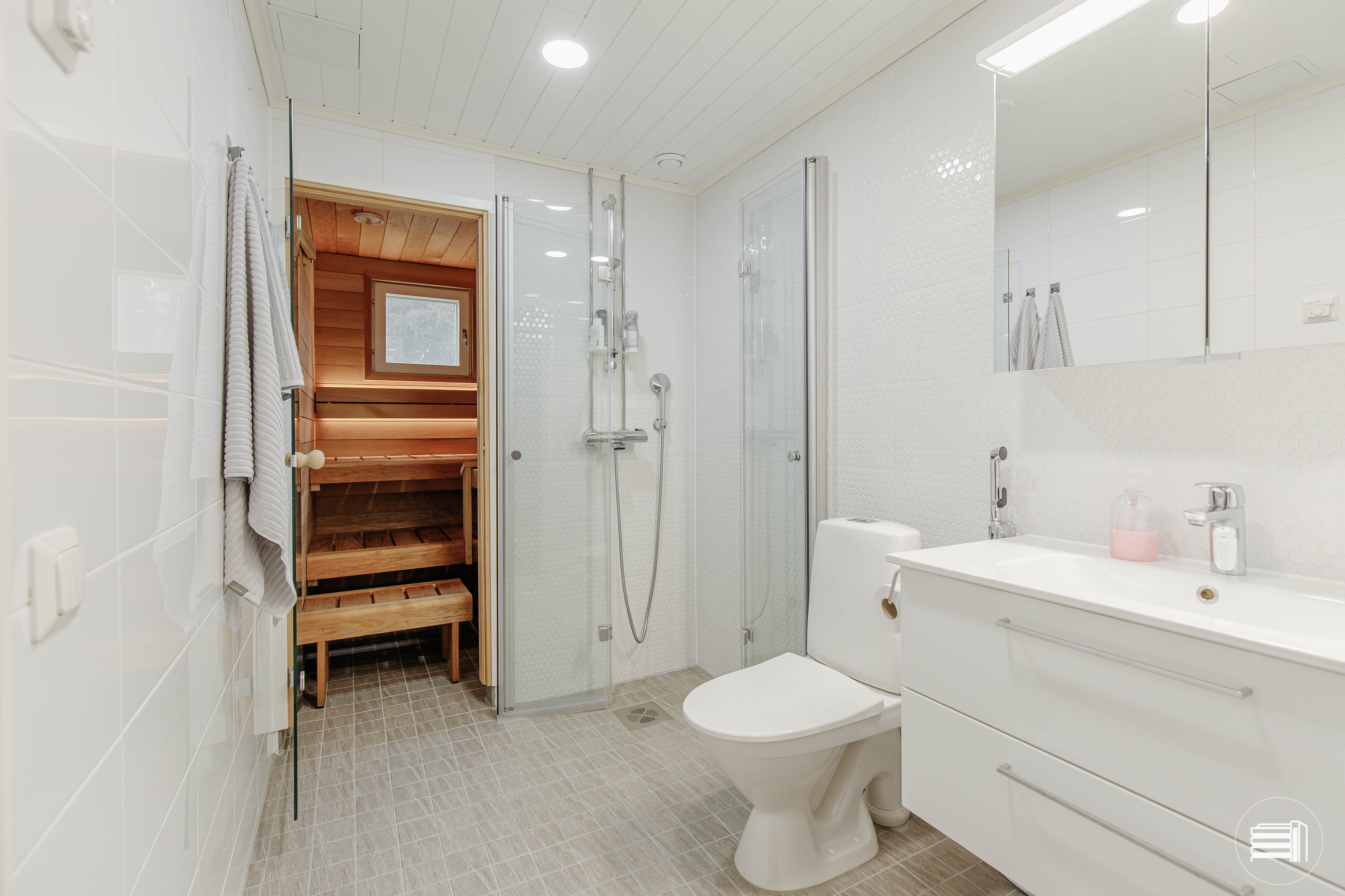 • pesuhuone remontoitu 2023, kokonaan kaakeloitu, kääntyvät suihkuseinät, allaskaapisto, wc-istuin