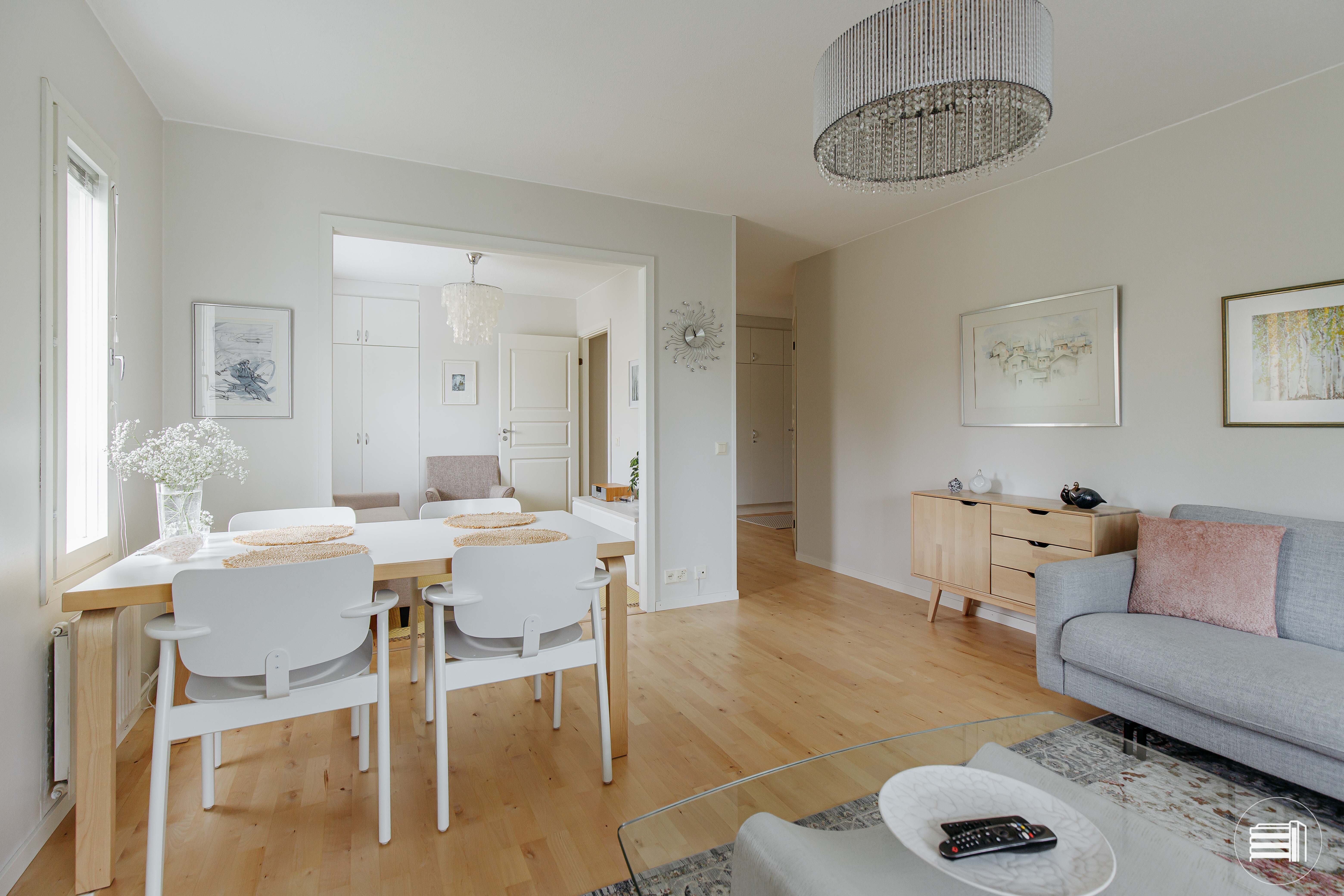 Ylimmän kerroksen (2.) hienokuntoinen päätyhuoneisto, jonka ikkunat 3 suuntaan. Seinien värimaailma on hienostuneen vaaleasävyinen luoden harmonisen tunnelman. Pesuhuone ja erillinen wc remontoitu laadukkaasti -23 ja myös huoneiston koivulautaparkettilattiat on hiottu ja lakattu -23.